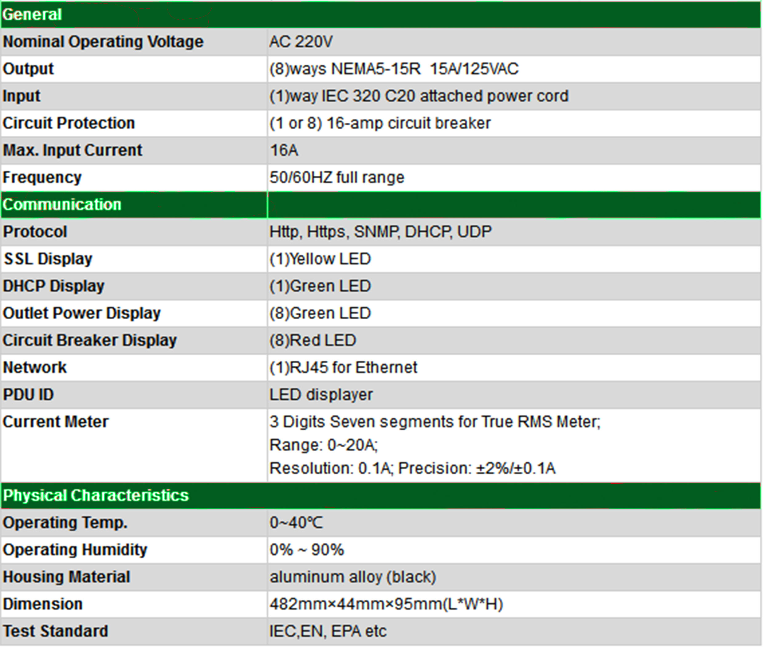 The 8 way 15A/125V NEMA5-15R Remotely Managed Intelligent PDU with RJ45 for Ethernet/IP Power Distribution Unit is a set of Internet ready equipment that offers essential functions such as power monitor, remote web power status viewing, and event alerts which helps system administrators or IT personnel to remotely monitor their connected devices and take preventive measures when needed. Each PDU server can connect 8 PDUs and each PDU can join 8 equipments to allow an administrator to monitor AC power devices via network. A PDU integrated with digital meter, it can work stand alone and co-operate with Cabinet Monitor to indicate its power consumption.