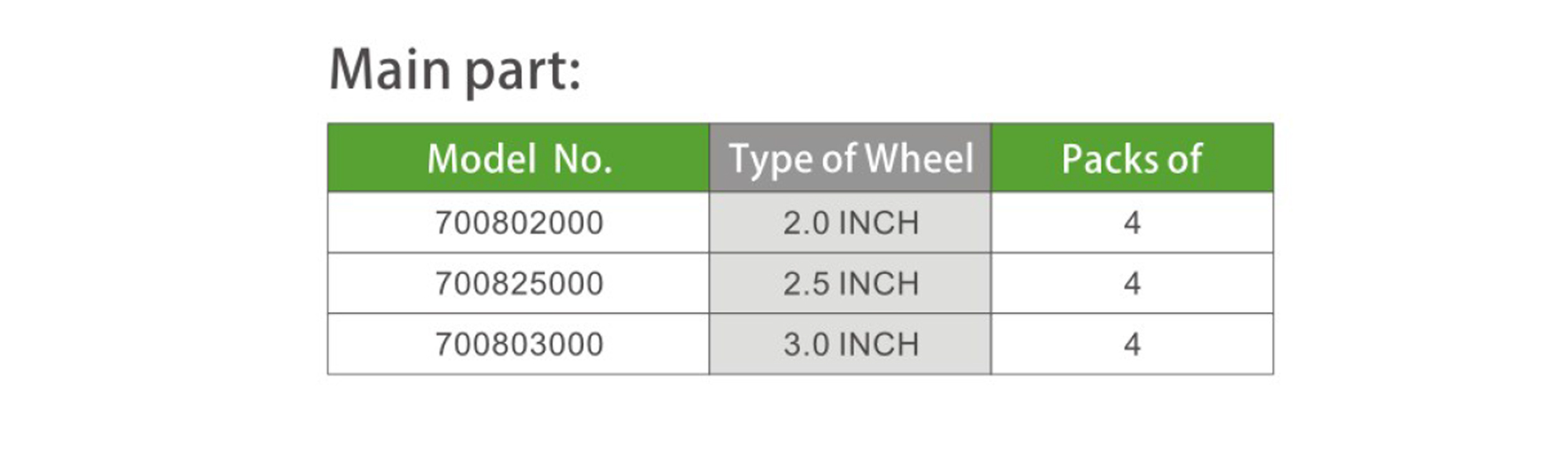 ■ Static load capacity: 250kg ■ Color: BLACK / Zinc-plated ■ Model No.: 700802000/700825000/700803000 ■ Type of wheel: 2.0 inch/2.5 inch/3.0 inch ■ Packs of: 4
