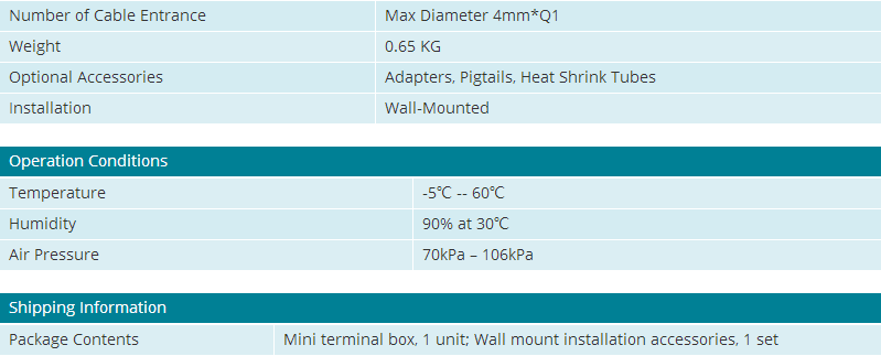 This mini style distribution box is widely applied in the FTTX network to connect drop cableand ONU devices through fiber port. It supports splicing, distribution, mechanical connection and wall mounted installation. The capacity of this box can be 1 core, 2 cores and 4 cores.