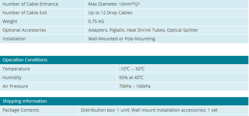 This distribution box terminates an outside optical cable with up to 12 fibers; it allocates 12 adapters for connecting with max 12 drop cable pigtails. The box works under both indoor and outdoor environments. It is a perfect cost-effective solution-provider in the FTTH networks.