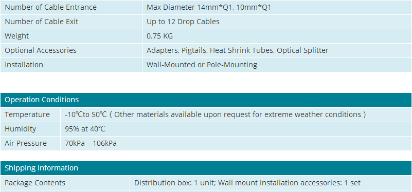 This distribution box terminates outside optical cables with up to 12fibers; it allocates 12adapters for connecting with max 12 drop cable pigtails, it is also suitable for using with mini splitters. The box works under both indoor and outdoor environments. It is a perfect cost-effective solution-provider in the FTTH networks.