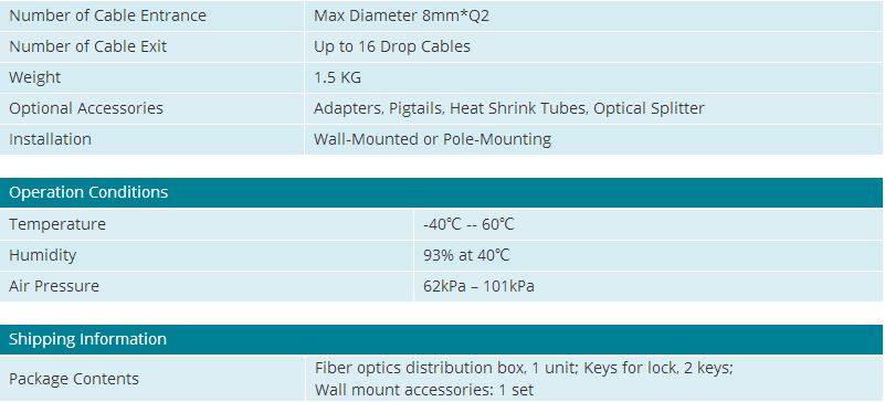 This fiber optics distribution box terminates up to 2 fiber optic cables, offers spaces for splitters and up to 16 fusions, allocates 16 SC adapters and working under outdoor environments. It is a perfect cost-effective solution-provider in the FTTx networks.